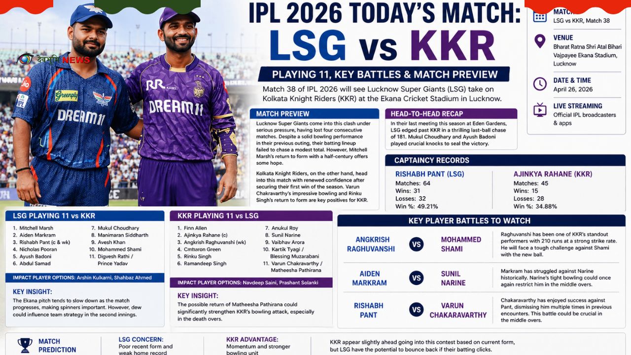 IPL 2026 Today’s Match: Match 38 of the Indian Premier League 2026 will see Lucknow Super Giants (LSG) face Kolkata Knight Riders (KKR) at the Ekana Cricket Stadium in Lucknow.
